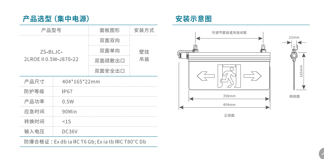 本安型防爆-疏散出口消防應(yīng)急標(biāo)志燈 | ZS-BLJC-2LROEⅡ0.5W-J870-22 | 壁掛/吊掛
