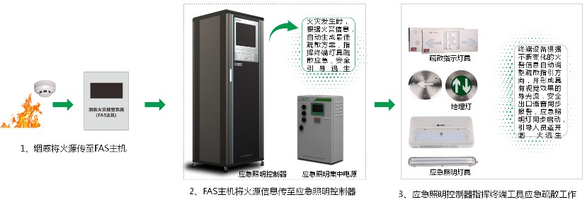 首先,煙感將火源傳至FAS(火災(zāi)報警系統(tǒng))主機,F(xiàn)AS主機再將火源信息傳至應(yīng)急照明控制器,火災(zāi)發(fā)生時,根據(jù)火警信息自動生成最佳疏散方案,指揮終端燈具疏散應(yīng)急,安全引導(dǎo)逃生。